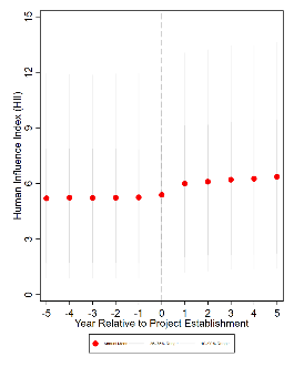 - No positive effect for “biodiversity-labelled” projects: Even projects that claim biodiversity co-benefits or operate within protected areas show increased disturbance.